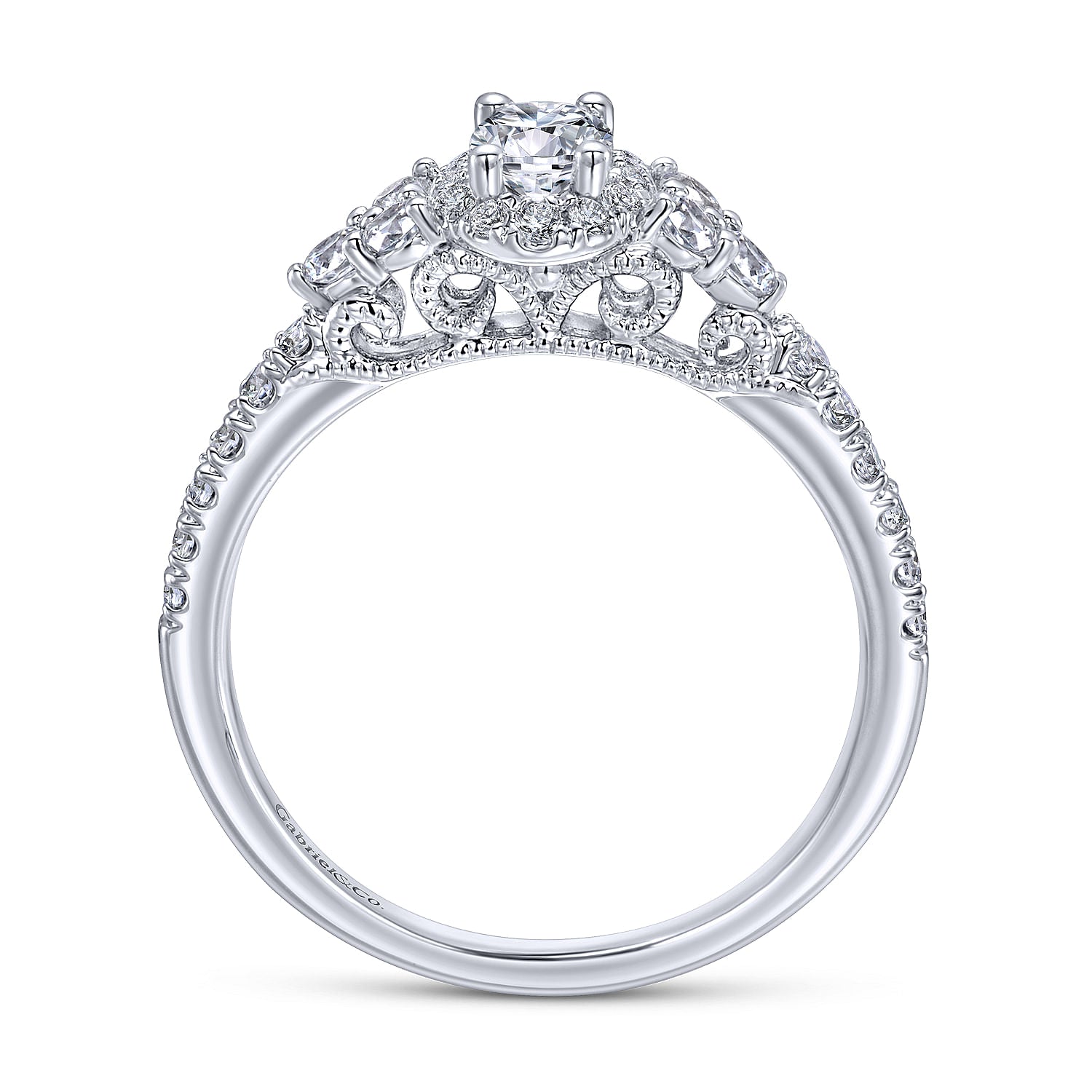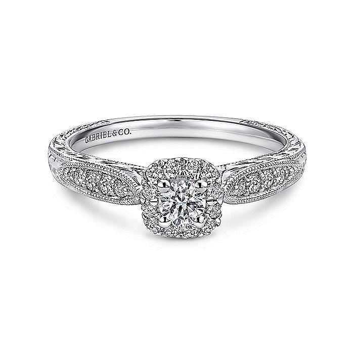 White Gold Vintage Inspired Cushion Halo Round Complete Diamond Engagement Ring