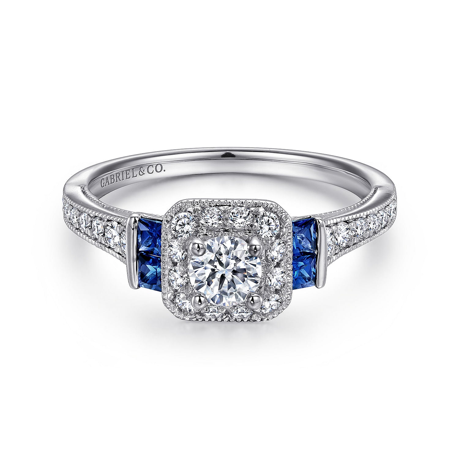 White Gold Sapphire and Diamond Princess Halo Complete Engagement Ring